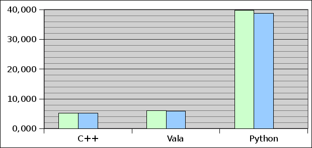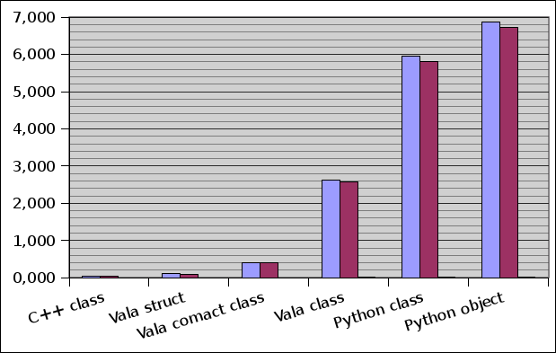 V případě C++ jsem do testu začlenil použití třídy (class) bez předka. Rozdíl v použití struktury (struct) je velmi malý a pro srovnání s jazykem Vala vlastně ne zcela vypovídající.