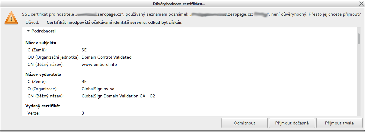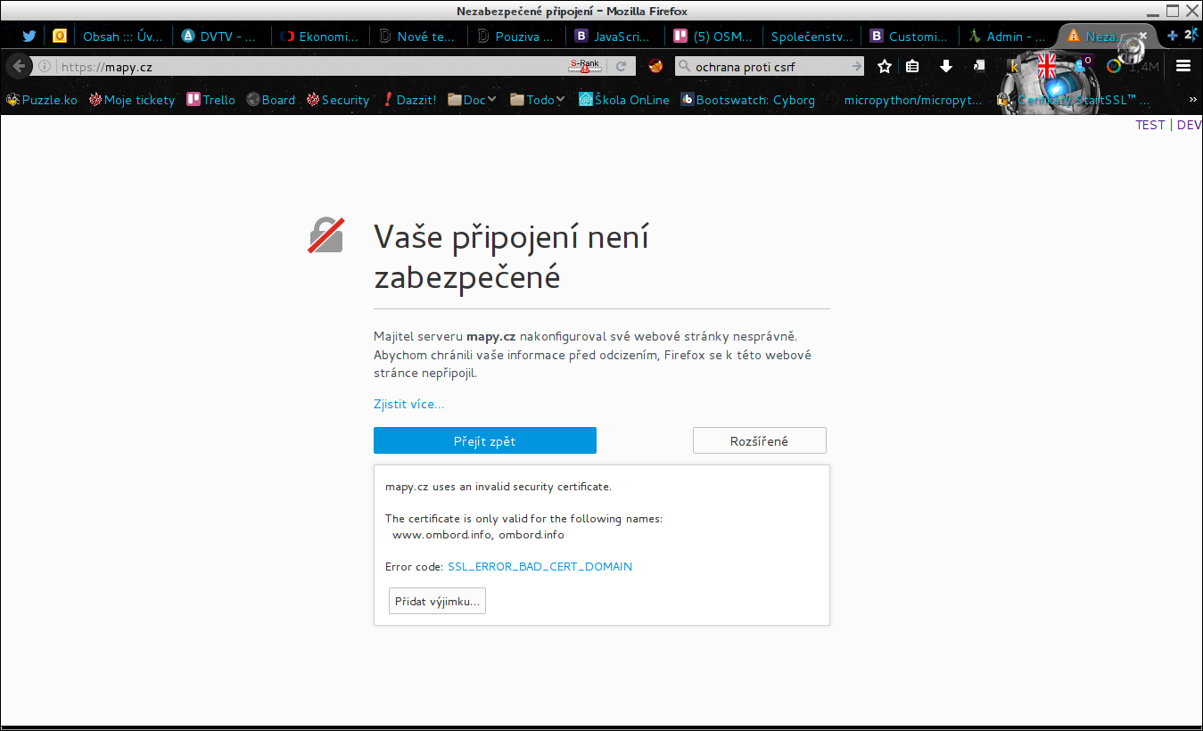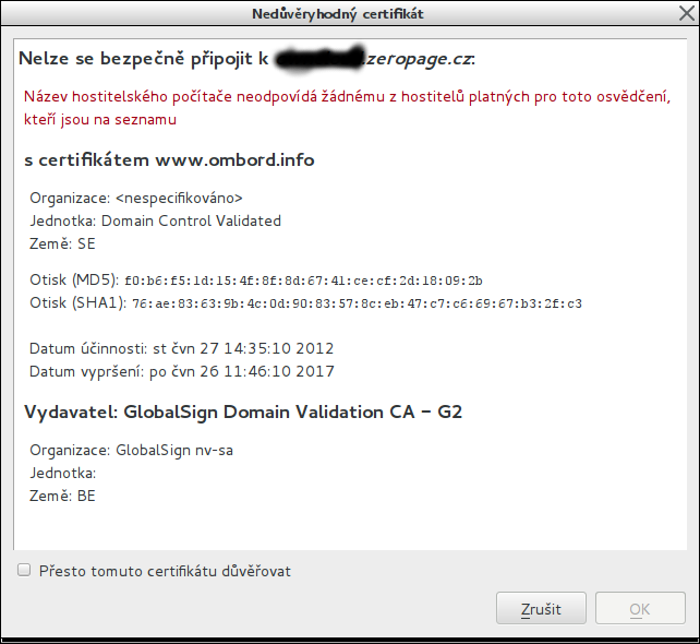 Díky tomto slabému místu, jsou uživatelé bohužel zvyklí, ignorovat chyby týkající se schválení nedůvěryhodného certifikátu. Ovšem těch chyb stran ověření certifikátu je několik. První se týká samotné nedůvěry v certifikační autoritu, která certifikát ověřila. Druhá se týká vypršení platnosti certifikátu. A třetí neshody domény, na kterou uživatel přistupuje a domény uvedené v certifikátu. Všechny tyto tři chyby je důležité brát vážně. A jak je vidět na snímcích obrazovky, chyby na které jsem byl upozorněn, byly právě ty poslední.