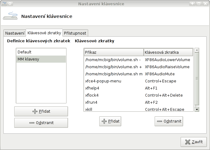 screenshot nastaveni klávesových zkratek v Xfce